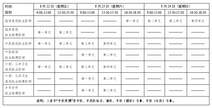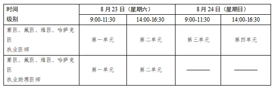考試實(shí)行計(jì)算機(jī)化考試,軍隊(duì)現(xiàn)役人員加試軍事醫(yī)學(xué)、院前急救崗位和兒科專業(yè)加試相應(yīng)內(nèi)容。中醫(yī)類別蒙醫(yī)、藏醫(yī)、維醫(yī)、哈薩克醫(yī)專業(yè)實(shí)行紙筆考試。統(tǒng)一考試時(shí)間如下:
