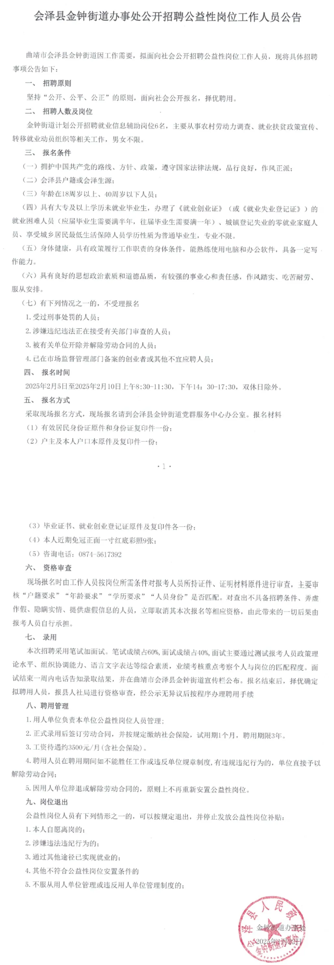 2025年曲靖市會澤縣金鐘街道辦事處招聘公告
