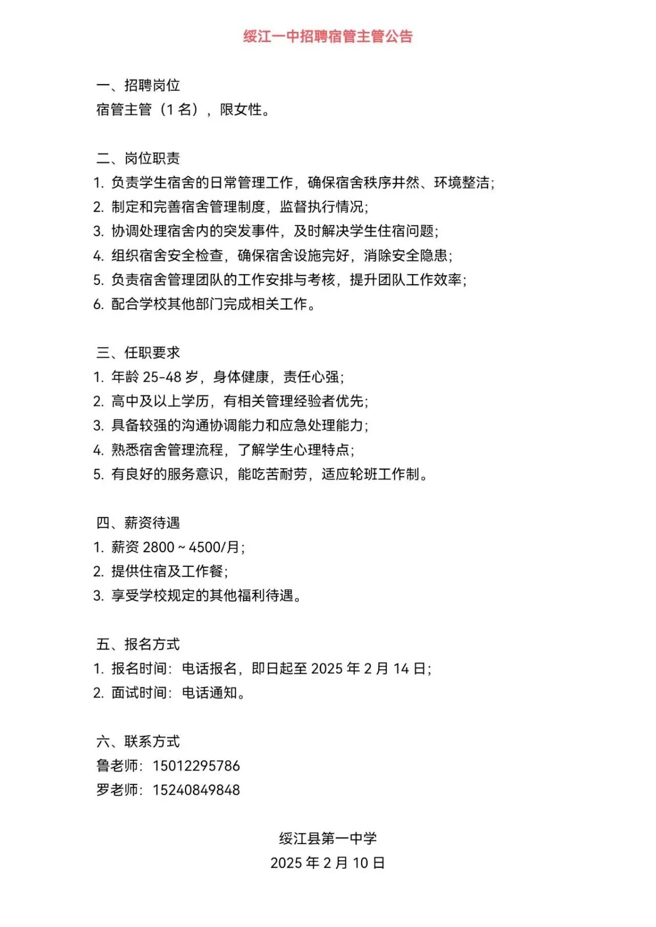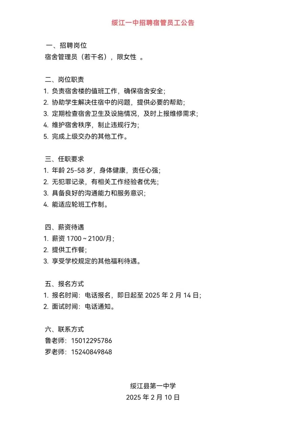 綏江縣第一中學(xué)招聘宿管主管一名、員工若干名