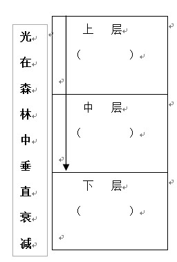 (3)在我國云南西雙版納地區(qū),人們運(yùn)用 的原理,模擬C地的雨林結(jié)構(gòu),建立起多層次的人工經(jīng)濟(jì)林,備選植物有:橡膠、咖啡、草果、茶樹。請(qǐng)你在上面未設(shè)計(jì)完的人工經(jīng)濟(jì)林模擬圖中的括號(hào)內(nèi)填入備選植物名稱。