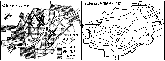 讀某城市功能區(qū)分布圖與該城市某季節(jié)地面SO2濃度分布圖,回答9—11題。