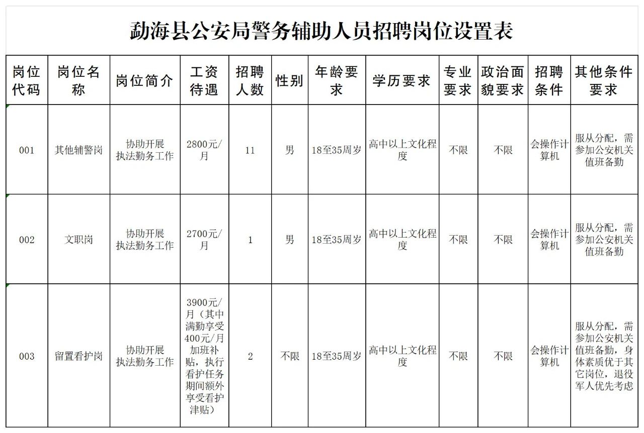 根據(jù)工作需要,勐海縣公安局現(xiàn)面向社會公開招聘警務(wù)輔助人員(以下簡稱輔警),有關(guān)事項公告如下: