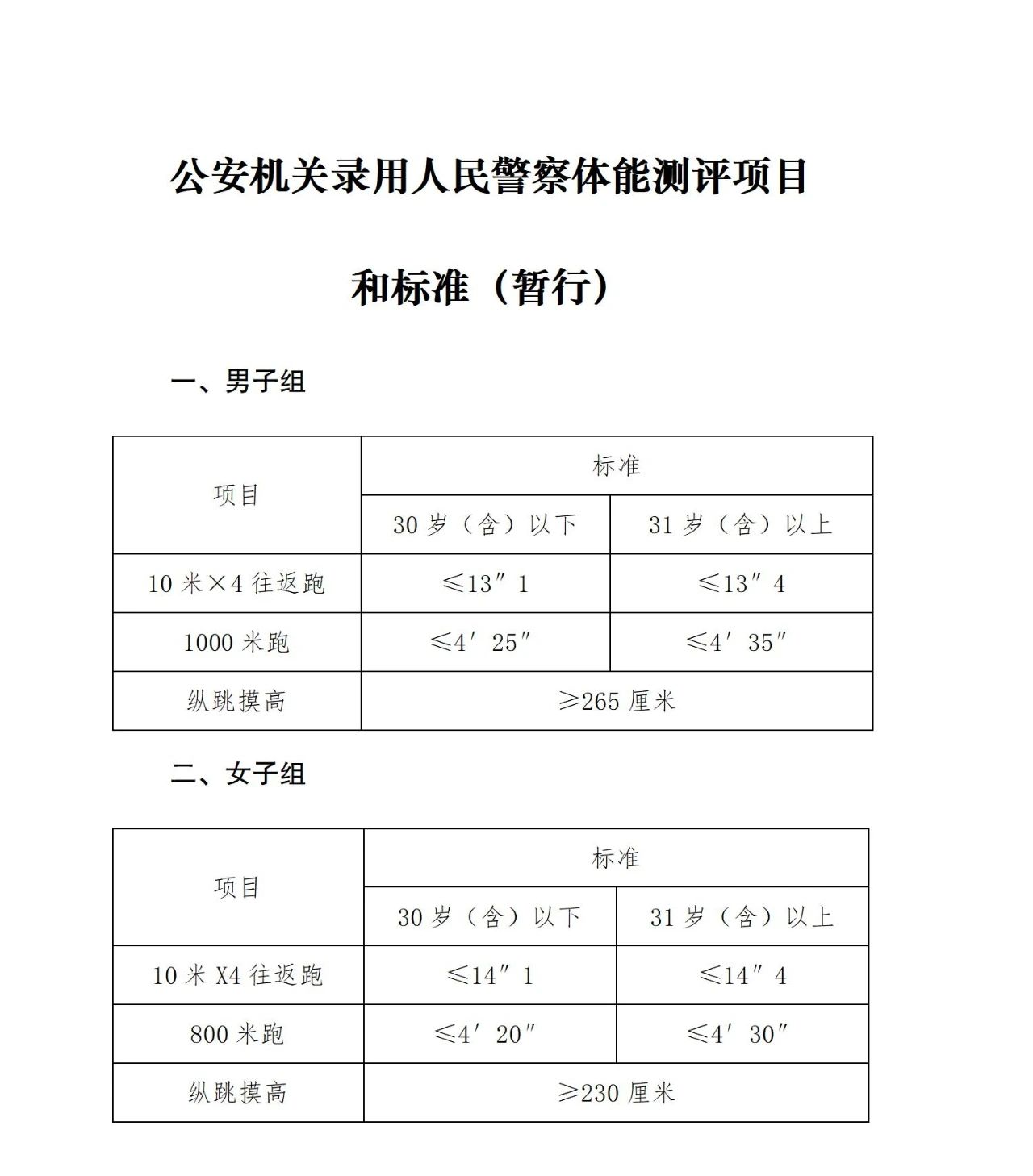 測評項目:男子:縱跳摸高、10米×4往返跑、1000米;女子:縱跳摸高、10米×4往返跑、800米。體能測評原則上參照《公安機(jī)關(guān)錄用人民警察體能測評項目和標(biāo)準(zhǔn)(暫行)》(詳情見附件)執(zhí)行,合格者進(jìn)入筆試、面試環(huán)節(jié)。