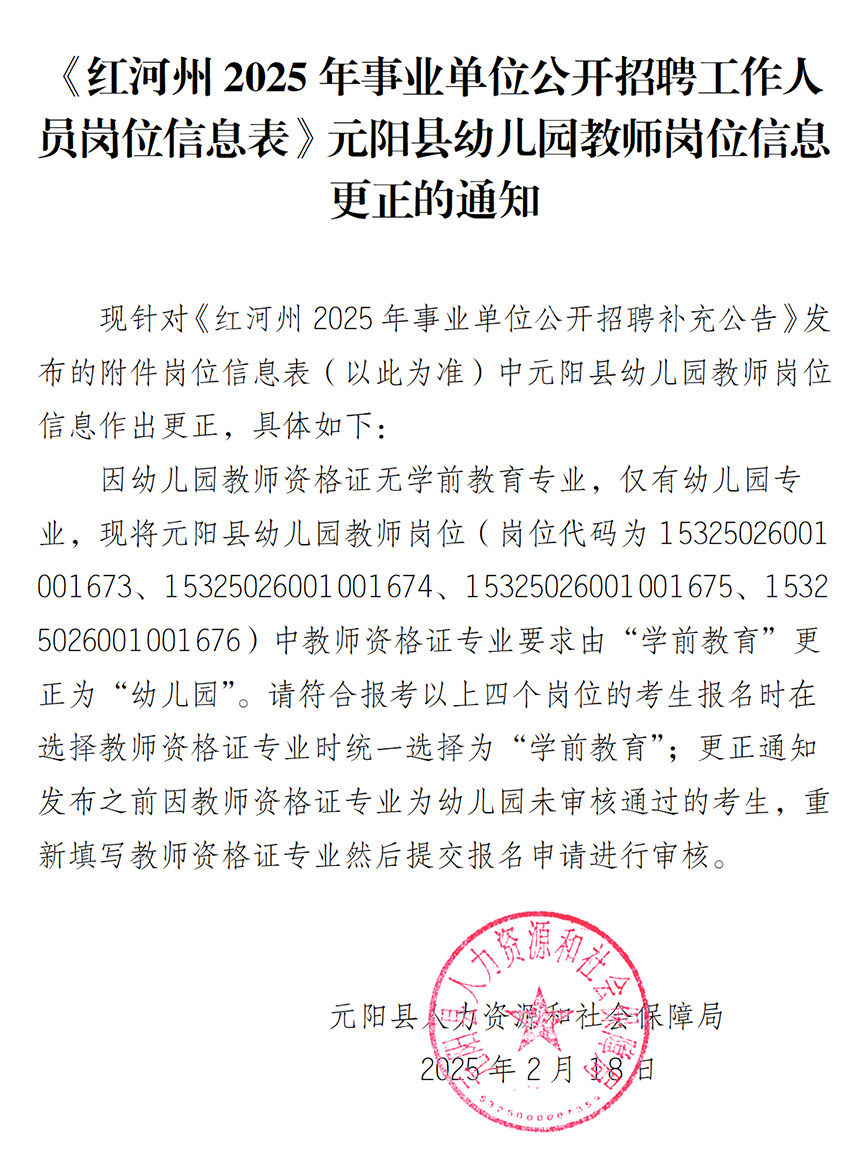 元陽縣幼兒園教師崗位信息更正的通知