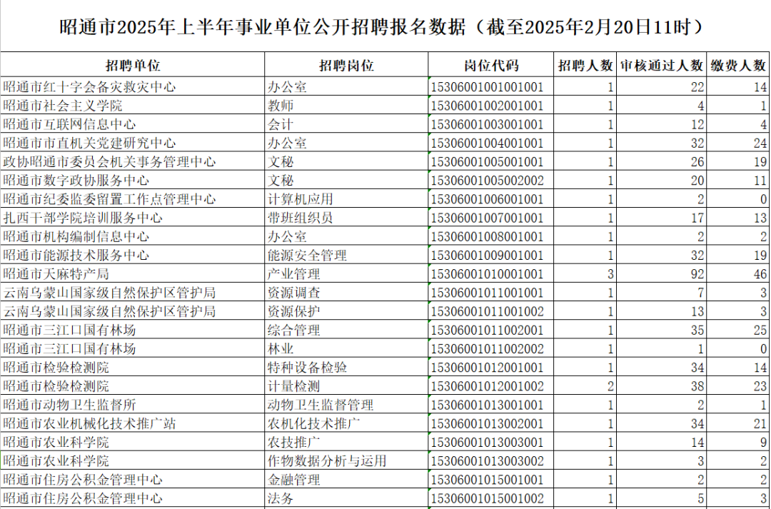 截至2025年2月20日11時,昭通市2025年事業(yè)單位公開招聘報名審核通過13379人,已繳費7261人,目前還有55個崗位無人報名。