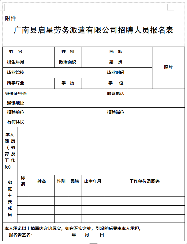 附件:廣南縣啟星勞務(wù)派遣有限公司招聘人員報(bào)名表