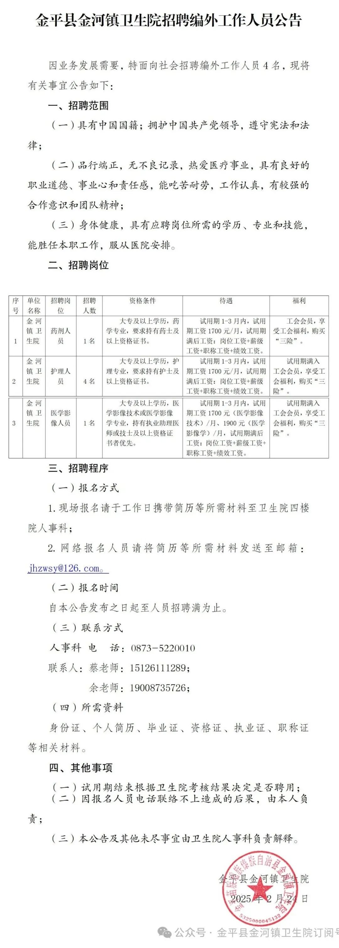 金平縣金河鎮(zhèn)衛(wèi)生院招聘編外工作人員公告