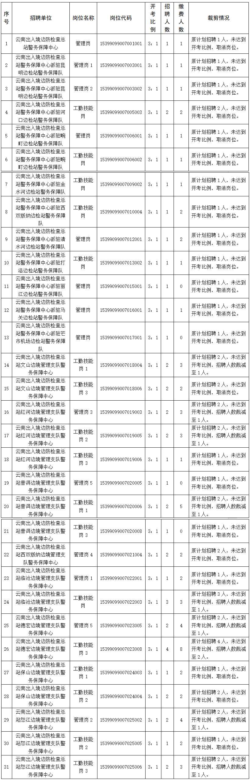 根據(jù)《2025年云南出入境邊防檢查總站所屬事業(yè)單位公開招聘人員公告》“每個崗位的繳費人數(shù)與計劃招聘人數(shù)不低于3:1方能開考。未達到3:1的,根據(jù)繳費人數(shù)予以裁減或取消。”的要求,結合網(wǎng)上報名、資格審查、繳費等情況,現(xiàn)將崗位裁減情況公告如下: