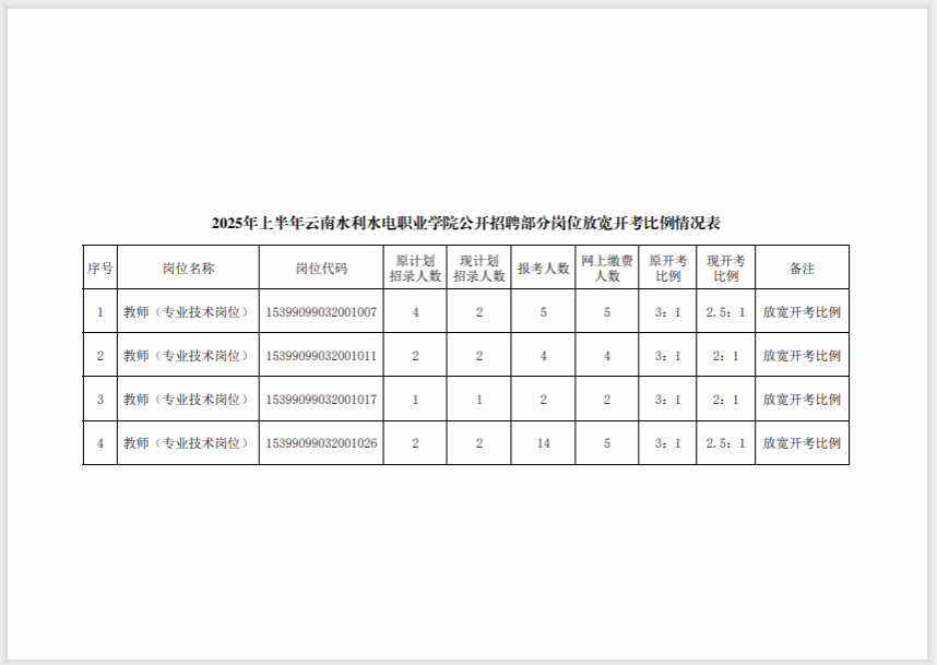 根據(jù)《2025年上半年云南水利水電職業(yè)學(xué)院公開(kāi)招聘人員公告》,經(jīng)云南省教育廳、云南省人力資源和社會(huì)保障廳批準(zhǔn),現(xiàn)將部分崗位放寬開(kāi)考比例情況公告如下: