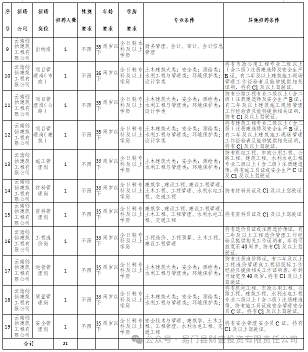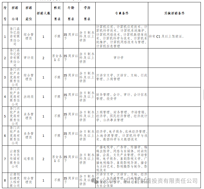 易門縣華億投資有限責(zé)任公司為縣屬國有企業(yè),現(xiàn)根據(jù)公司及下屬全資子公司業(yè)務(wù)發(fā)展需要,特面向社會公開招聘21名工作人員,本次招聘公司為易門縣華億投資有限責(zé)任公司、易門興牧產(chǎn)業(yè)發(fā)展有限責(zé)任公司、云南菌鄉(xiāng)文化傳媒有限責(zé)任公司和云南創(chuàng)怡建筑工程有限公司。由易門縣財盛投資有限責(zé)任公司按照相關(guān)程序組織實施招聘,具體招聘事宜公告如下: