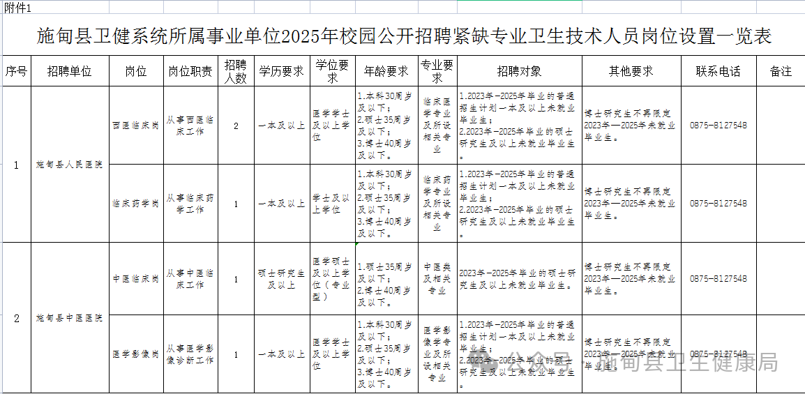 附件:1.《施甸縣衛(wèi)健系統(tǒng)所屬事業(yè)單位2025年校園公開(kāi)招聘緊缺專(zhuān)業(yè)衛(wèi)生技術(shù)人員崗位設(shè)置一覽表》