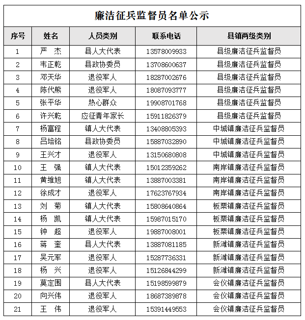 廉潔征兵監(jiān)督員名單公示