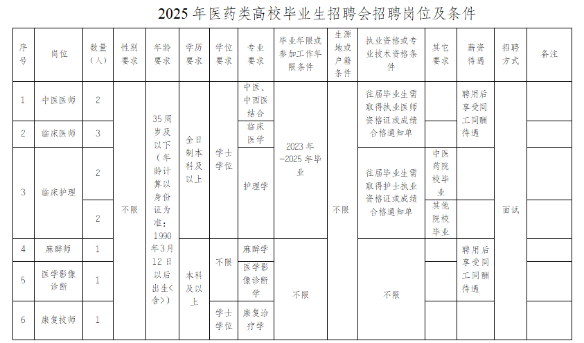 因醫(yī)院業(yè)務(wù)發(fā)展需要,結(jié)合醫(yī)院實(shí)際,參加云南省衛(wèi)生健康委云南省教育廳關(guān)于聯(lián)合舉辦云南省2025年醫(yī)藥類(lèi)高校畢業(yè)生招聘會(huì)(云南中醫(yī)藥大學(xué)、昆明醫(yī)科大學(xué)、昆明醫(yī)科大學(xué)海源學(xué)院),面向醫(yī)藥類(lèi)高校應(yīng)往屆畢業(yè)生公開(kāi)招聘12名中醫(yī)學(xué)、臨床醫(yī)學(xué)、麻醉學(xué)、護(hù)理學(xué)、醫(yī)技類(lèi)專業(yè)編制外合同制專業(yè)技術(shù)人員,現(xiàn)將招聘有關(guān)事項(xiàng)公告如下: