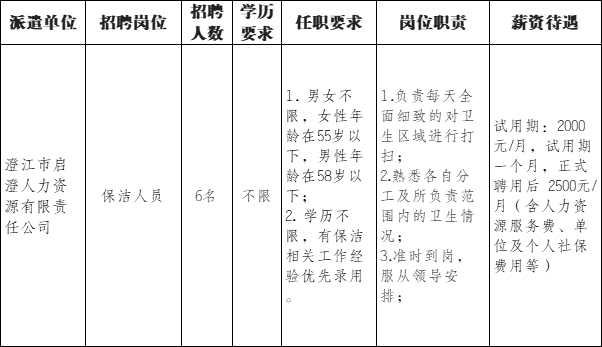 因工作需要,澄江市啟澄人力資源有限責任公司現(xiàn)面向社會公開招聘勞務派遣人員6名,現(xiàn)將有關事項公告如下: