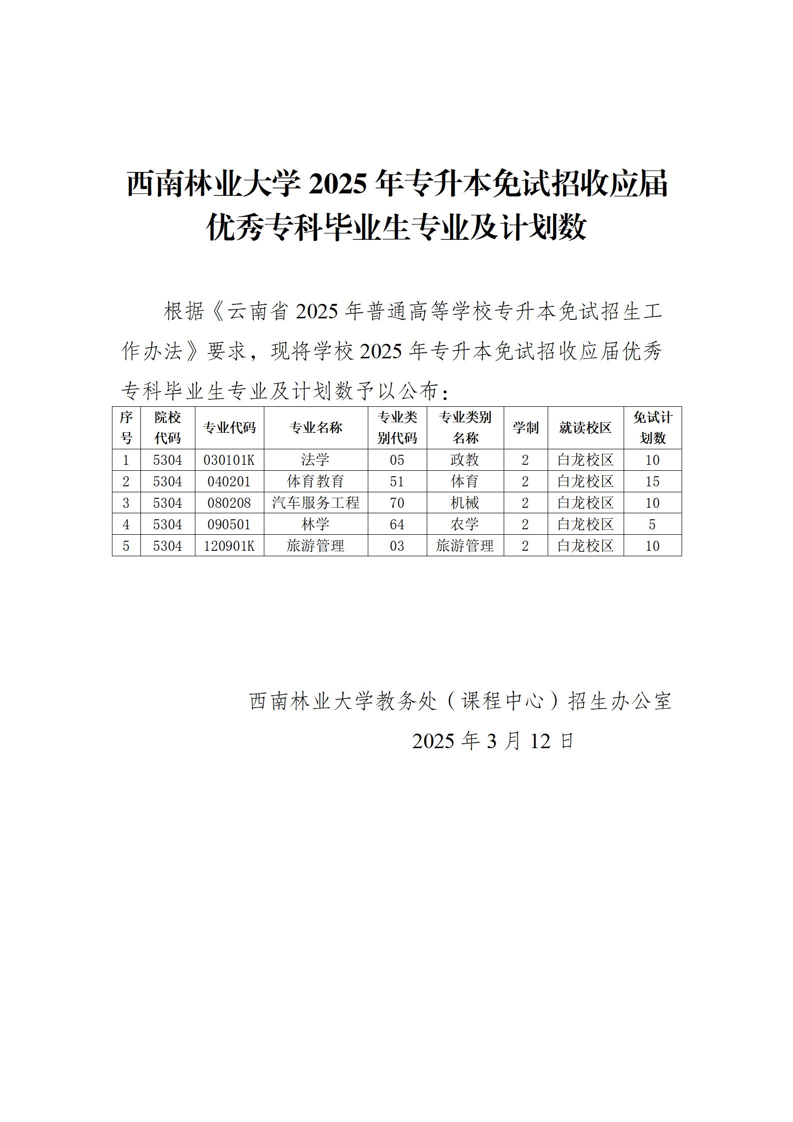 西南林業(yè)大學(xué)2025年專升本免試招收應(yīng)屆優(yōu)秀??飘厴I(yè)生專業(yè)及計(jì)劃數(shù)