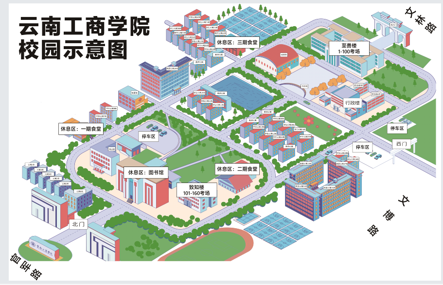 云南工商學(xué)院的考生可從學(xué)校西門、北門、南門進(jìn)入考點(diǎn),考生可結(jié)合考場示意圖就近選擇校門入口,其中駕車進(jìn)入考點(diǎn)學(xué)校的考生需從西門或北門駛?cè)耄祥T僅可步行進(jìn)入)。