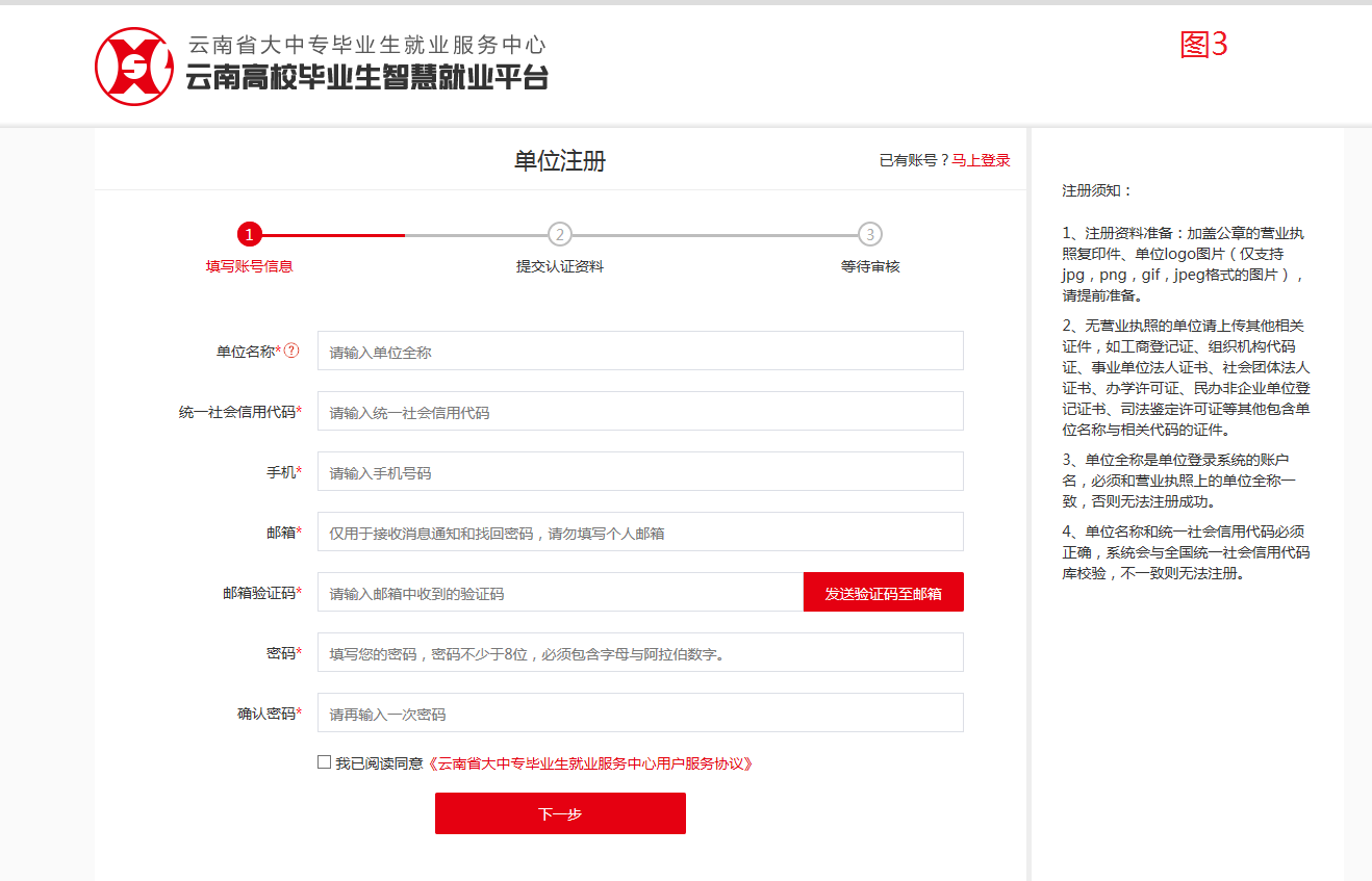 注冊登錄:參會單位須于3月28日(星期五)之前登錄紅河衛(wèi)生職業(yè)學(xué)院就業(yè)信息網(wǎng)(http://hhwzy.ynbys.cn/),選擇“單位登錄——立即注冊”填寫單位具體信息申請入駐我校(操作流程如圖1、圖2、圖3所示),等待審核通過(已在我校就業(yè)信息網(wǎng)注冊過的單位跳過此步,無需重復(fù)注冊)。