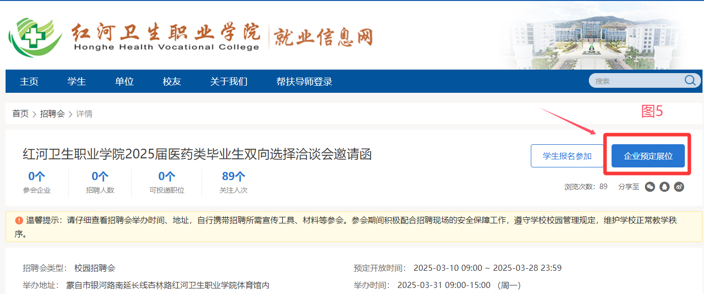 (二)預(yù)定展位:點擊“紅河衛(wèi)生職業(yè)學(xué)院2025屆醫(yī)藥類畢業(yè)生大型雙向選擇洽談會”端口進(jìn)入“企業(yè)預(yù)定展位”(操作流程如圖4、圖5所示)。