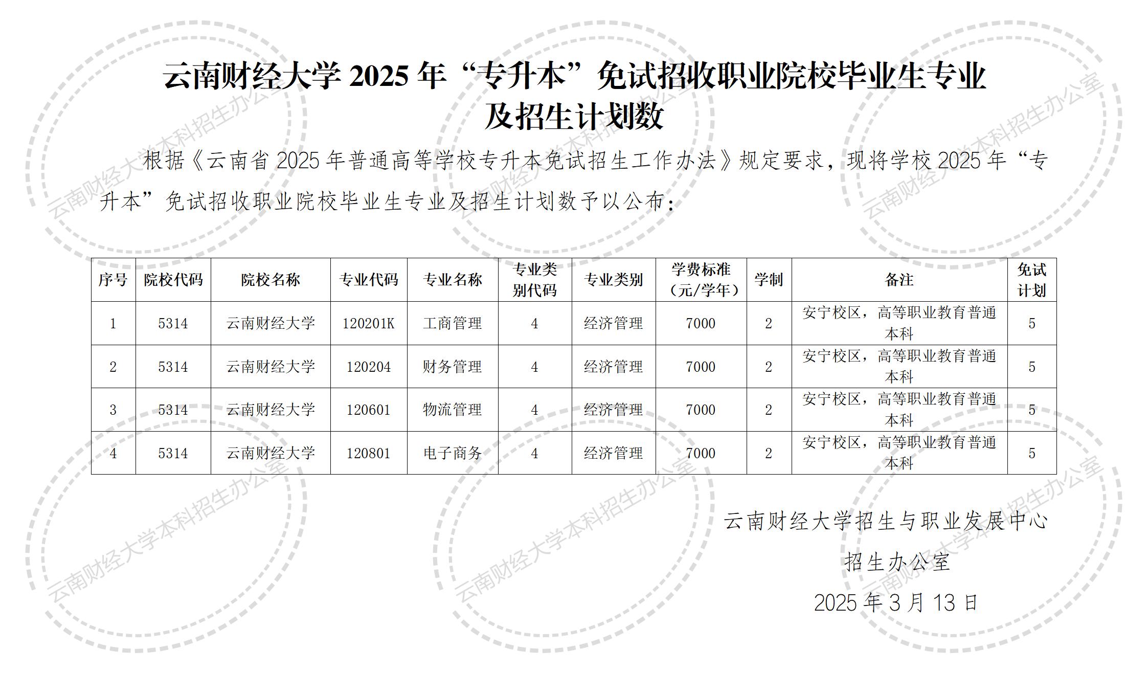 云南財經(jīng)大學(xué)2025年“專升本”免試招收職業(yè)院校畢業(yè)生專業(yè)及招生計劃數(shù)