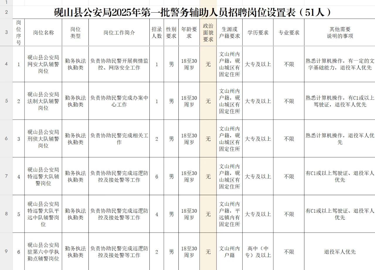 硯山縣公安局此次面向社會(huì)公開(kāi)招聘輔警51名。招聘崗位及人數(shù)詳見(jiàn)《硯山縣公安局2025年第一批警務(wù)輔助人員招聘崗位設(shè)置表》。