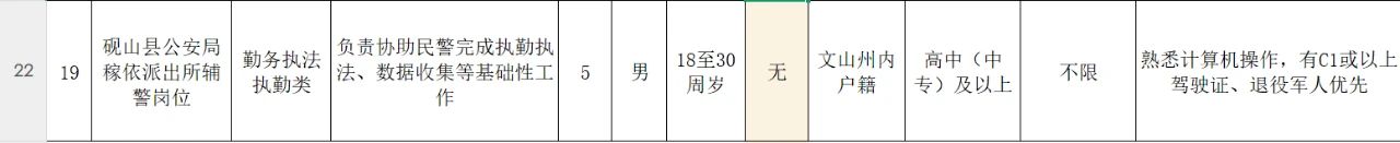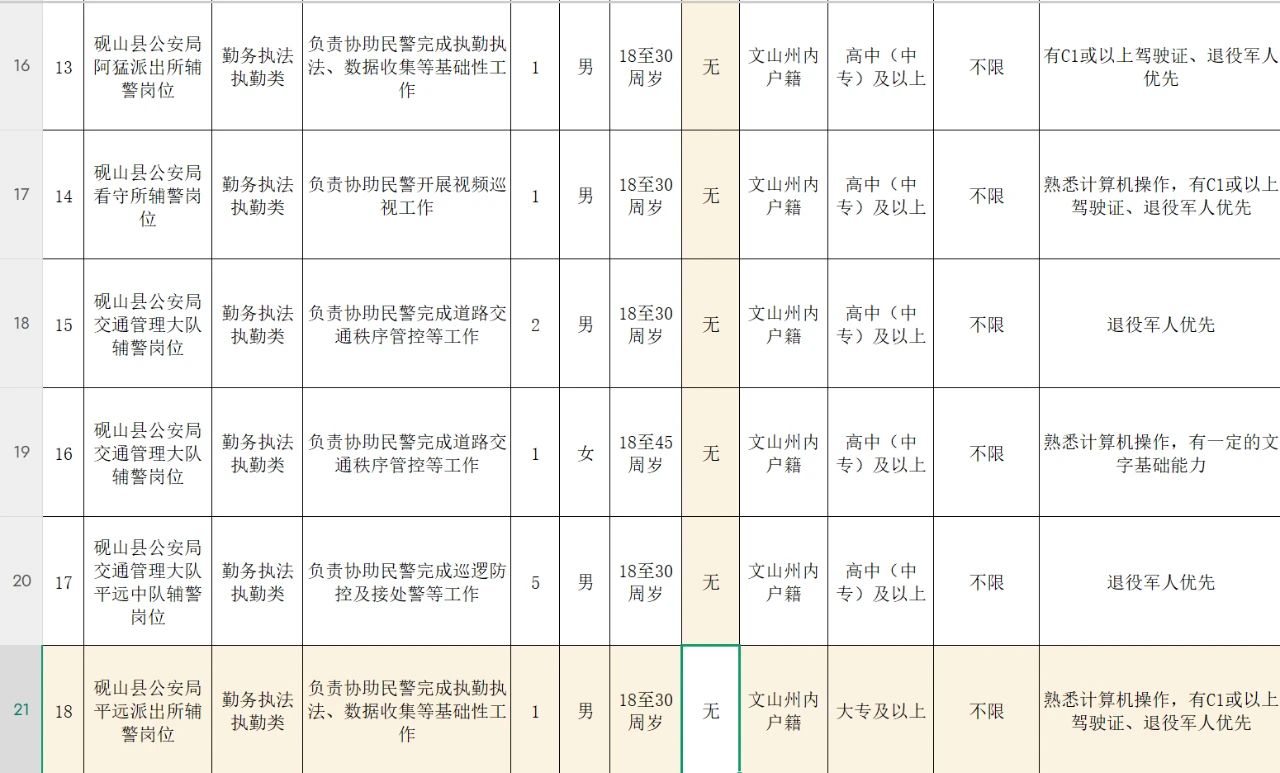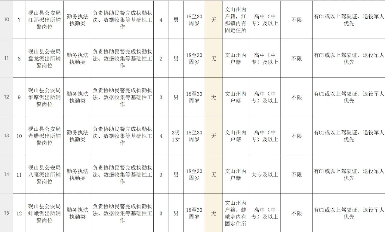 2、年滿18至45周歲(1995年3月14日出生至2007年3月14日出生)的中華人民共和國(guó)公民,具有招聘崗位所要求的文化程度及其他要求(詳見(jiàn)《硯山縣公安局2025年第一批警務(wù)輔助人員招聘崗位設(shè)置表》)。