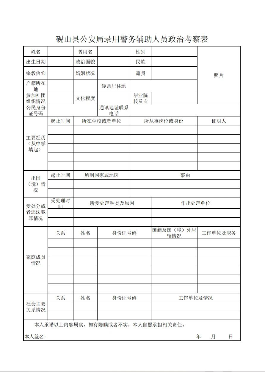 (4) 真實(shí)完整填寫好的《硯山縣公安局輔警招聘報(bào)名表》、《硯山縣公安局輔警招聘誠(chéng)信承諾書(shū)》、《硯山縣公安局錄用警務(wù)輔助人員政治考察表》;