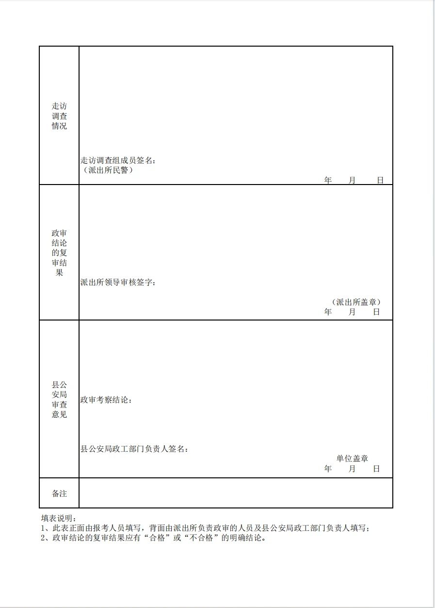 政審參照公安機(jī)關(guān)人民警察錄用政審標(biāo)準(zhǔn)執(zhí)行,由戶籍所在地派出所具體實(shí)施。