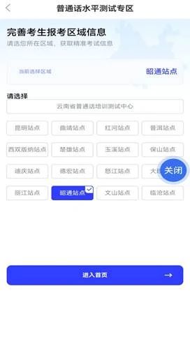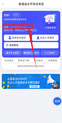 完成實名認證后,在APP首頁找到“普通話測試報名”,點擊進入普通話水平測試專區(qū)界面,選擇“云南省普通話培訓測試中心”后,點擊“進入首頁”。