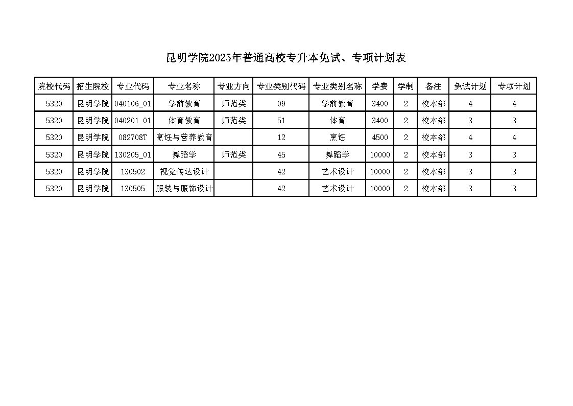 2025年昆明學(xué)院普通高校專升本免試、專項(xiàng)計(jì)劃表