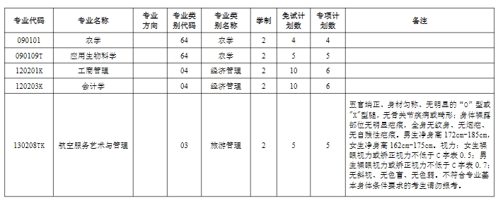 根據(jù)云南省教育廳《云南省2025年普通高等學(xué)校專升本統(tǒng)一考試招生工作辦法》和《云南省2025年普通高等學(xué)校專升本免試招生工作辦法》要求,現(xiàn)將我校2025年專升本招生專業(yè)及免試計(jì)劃、專項(xiàng)計(jì)劃數(shù)予以公布: