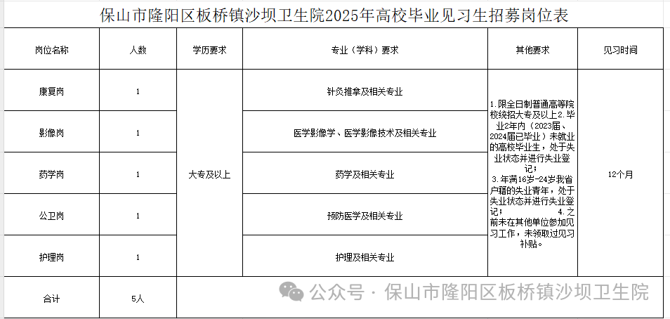 保山市隆陽區(qū)板橋鎮(zhèn)沙壩衛(wèi)生院2025年見習(xí)生招聘公告