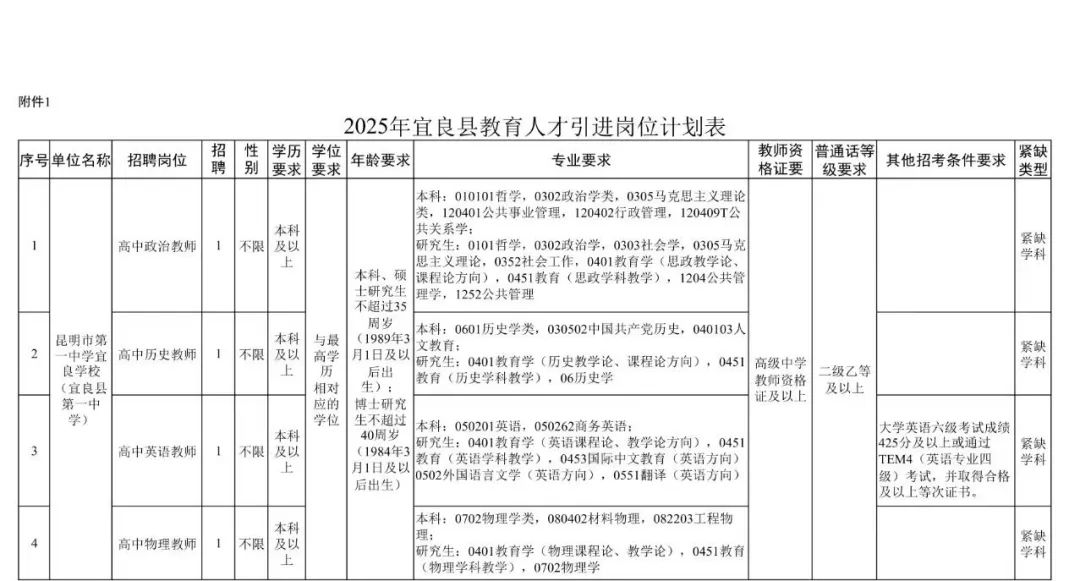 昆明市第一中學(xué)宜良學(xué)校2025年人才引進(jìn)崗位設(shè)置表