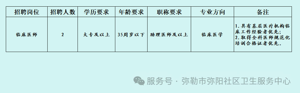為加強(qiáng)基層醫(yī)療衛(wèi)生人才隊(duì)伍建設(shè),提升社區(qū)衛(wèi)生服務(wù)能力,經(jīng)研究決定,彌勒市彌陽(yáng)社區(qū)衛(wèi)生服務(wù)中心現(xiàn)面向社會(huì)公開(kāi)招聘合同制臨床醫(yī)師2名。具體事項(xiàng)公告如下: