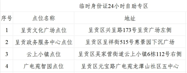 呈貢區(qū)政務(wù)服務(wù)管理局在以下4個地點為因忘記攜帶、遺失身份證的考生提供臨時身份證打印服務(wù)。