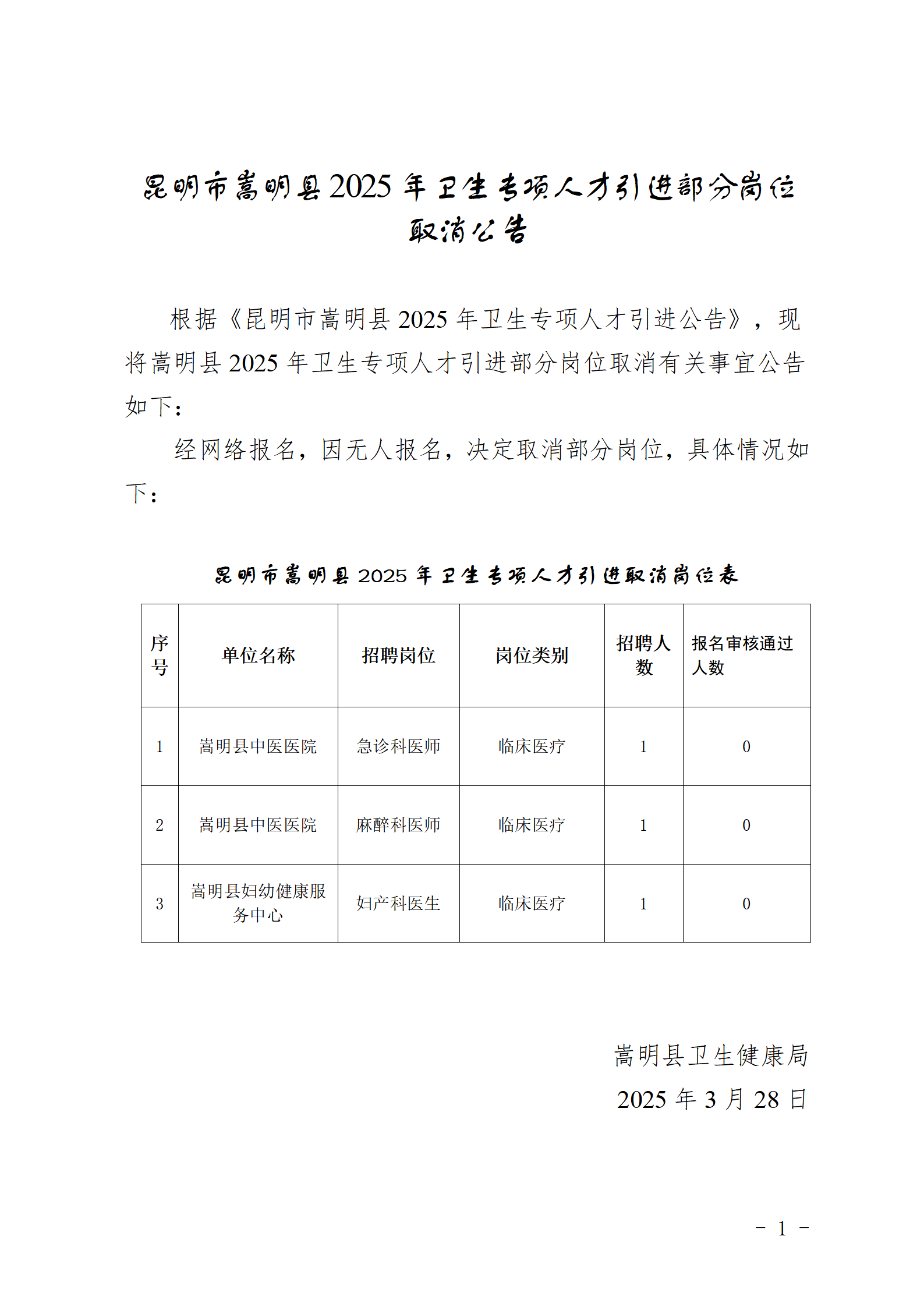 昆明市嵩明縣2025年衛(wèi)生專項(xiàng)人才引進(jìn)部分崗位取消公告
