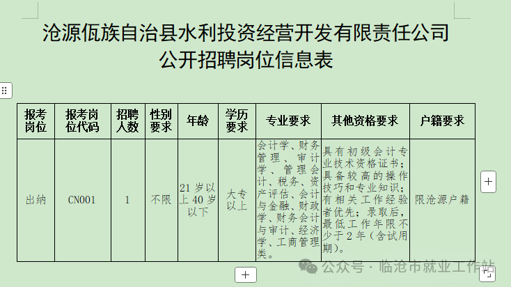 滄源佤族自治縣水利投資經(jīng)營開發(fā)有限責(zé)任公司2025年公開招聘公告