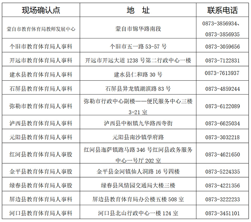 紅河學(xué)院應(yīng)屆畢業(yè)生、紅河職業(yè)技術(shù)學(xué)校(原民族師范學(xué)校)應(yīng)屆畢業(yè)生到設(shè)在本校的現(xiàn)場確認點進行現(xiàn)場確認。現(xiàn)場確認時間及地點由學(xué)校自行安排,申請人應(yīng)以學(xué)校通知為準,但現(xiàn)場確認工作必須于本公告中現(xiàn)場確認時間內(nèi)完成。其余符合條件的紅河州轄區(qū)內(nèi)普通高校應(yīng)屆畢業(yè)生到學(xué)校所在屬地教育體育局確認點確認,請注意關(guān)注相關(guān)確認機構(gòu)的公告。