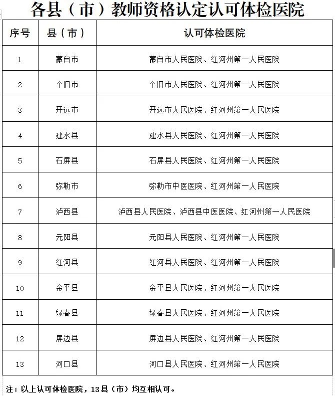 (7)《云南省申請(qǐng)教師資格認(rèn)定人員體檢表》原件(見(jiàn)附件1)。經(jīng)紅河州轄區(qū)內(nèi)縣級(jí)以上公立醫(yī)院體檢后(認(rèn)可體檢醫(yī)院詳見(jiàn)附件2),體檢結(jié)論簽署 “合格”且有體檢醫(yī)院意見(jiàn)并加蓋公章的《云南省教師資格認(rèn)定體檢表》原件,體檢報(bào)告僅限當(dāng)次認(rèn)定有效。