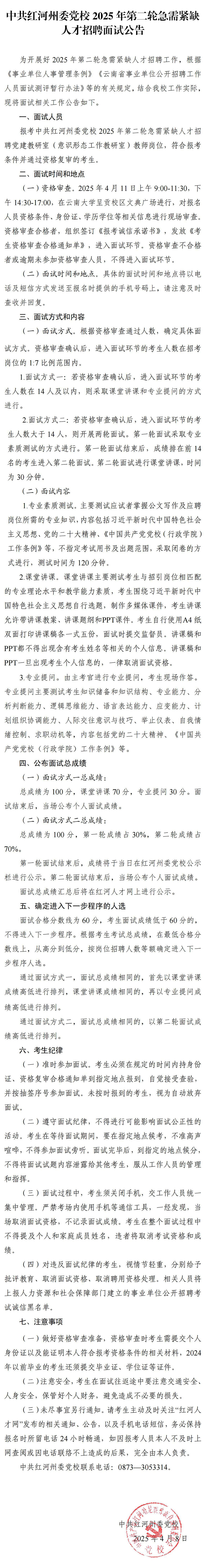 中共紅河州委黨校 2025年第二輪急需緊缺人才招聘面試公告