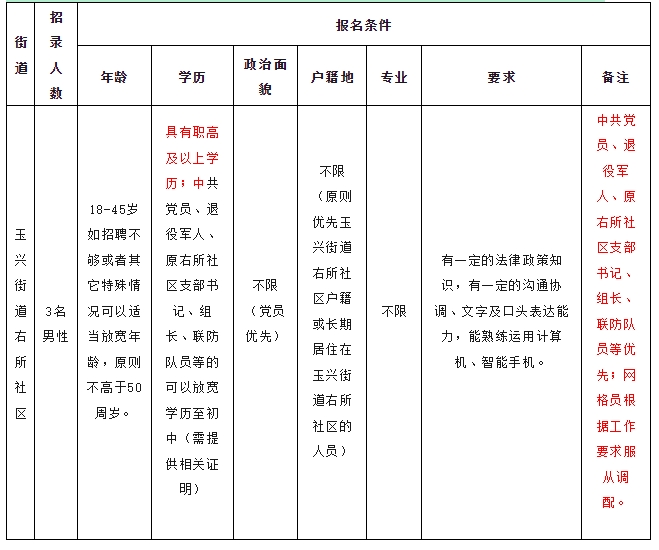 6、優(yōu)先條件:中共黨員、退役軍人、原右所社區(qū)支部書記、組長、聯(lián)防隊員等優(yōu)先;