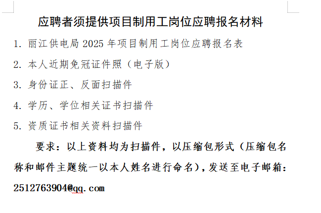 應(yīng)聘者須按照附件3《提交材料清單》提供項目制用工崗位應(yīng)聘報名材料,填寫附件2《麗江供電局2025年項目制用工崗位應(yīng)聘報名表》,并附本人近期免冠證件照、身份證、畢業(yè)證、資格證書等相關(guān)材料掃描文件,以壓縮包形式(壓縮包名稱和郵件主題統(tǒng)一以本人姓名進行命名),發(fā)送至電子郵箱:2512763904@qq.com。