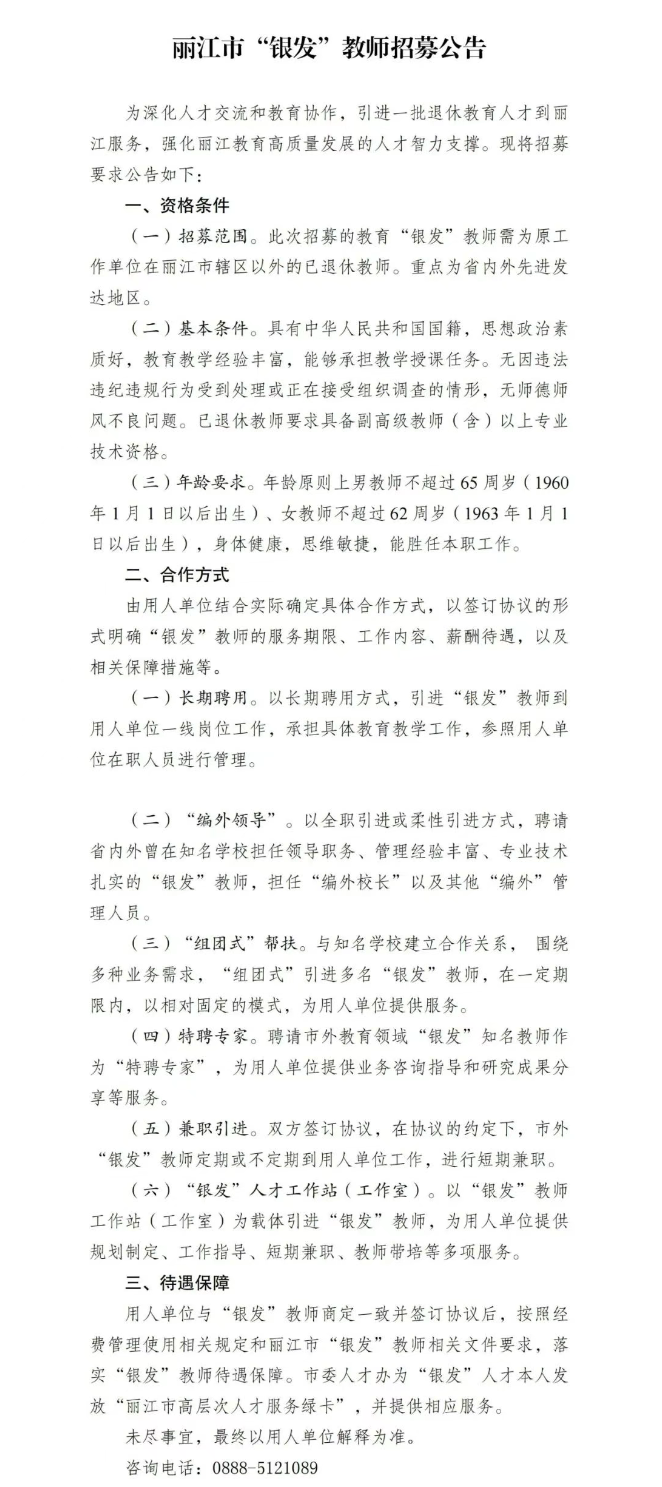 麗江市“銀發(fā)”教師招募公告 為充分發(fā)揮退休教師資源優(yōu)勢,促進教育優(yōu)質均衡發(fā)展,麗江市教育局現(xiàn)面向社會公開招募“銀發(fā)”教師。具體事項公告如下: