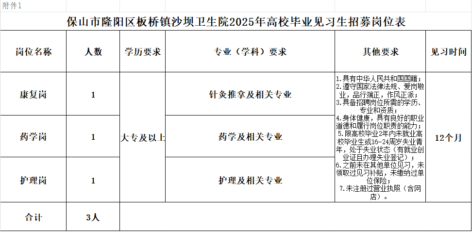 附件1:附件1:保山市隆陽(yáng)區(qū)板橋鎮(zhèn)沙壩衛(wèi)生院2025年招聘見(jiàn)習(xí)人員崗位設(shè)置表.xlsx