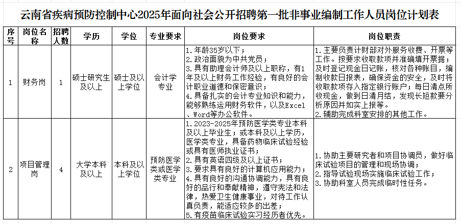 附件:1.云南省疾病預(yù)防控制中心2025年面向社會公開招聘第一批非事業(yè)編制工作人員崗位計(jì)劃表