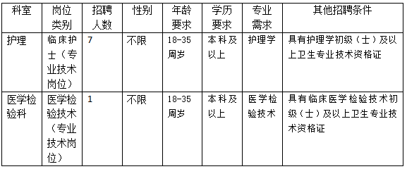 一、此次面向社會(huì)公開招聘臨床護(hù)士7名、醫(yī)學(xué)檢驗(yàn)1名,共計(jì)8名。(性別不限)