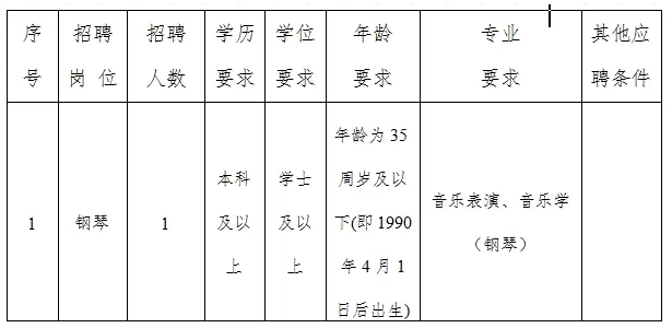 本次公開(kāi)招聘崗位為專(zhuān)業(yè)技術(shù)崗,共招聘人員1名,崗位為鋼琴演奏員。具體招聘崗位及招聘條件,詳見(jiàn)《2025年昆明聶耳交響樂(lè)團(tuán)公開(kāi)招聘人員計(jì)劃表》(附件1)。本次招聘崗位不占用單位事業(yè)編制,用工形式為勞務(wù)派遣。