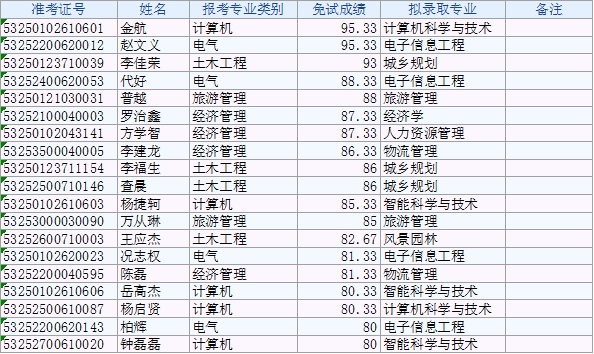 根據(jù)云南省教育廳《關(guān)于印發(fā)云南省2025年普通高等學(xué)校招收應(yīng)屆??飘厴I(yè)生升學(xué)統(tǒng)一招生考試試行辦法的通知》《關(guān)于普通本科高等學(xué)校免試招收職業(yè)院校技能拔尖畢業(yè)生的指導(dǎo)意見》文件精神,依據(jù)2025年昆明文理學(xué)院專升本免試綜合考查(面試)相關(guān)考生成績(jī),我校專升本免試擬錄取名單如下: