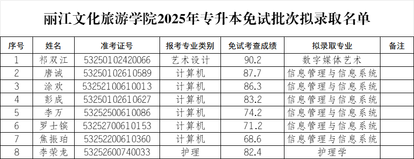 麗江文化旅游學(xué)院2025年專(zhuān)升本免試批次預(yù)錄取名單