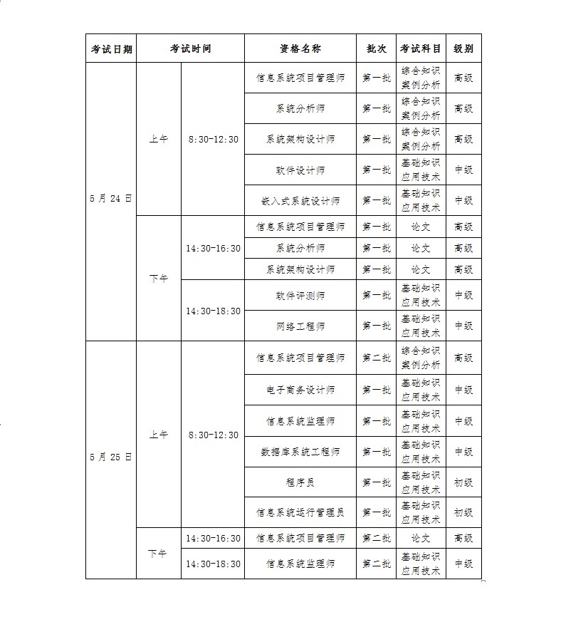 按照工業(yè)和信息化部教育與考試中心《關(guān)于2025年上半年計(jì)算機(jī)技術(shù)與軟件專業(yè)技術(shù)資格(水平)考試批次安排的通知》(工信教〔2025〕16號(hào))文件精神,2025年上半年計(jì)算機(jī)技術(shù)與軟件專業(yè)技術(shù)資格(水平)考試云南考區(qū)考試批次安排如下: