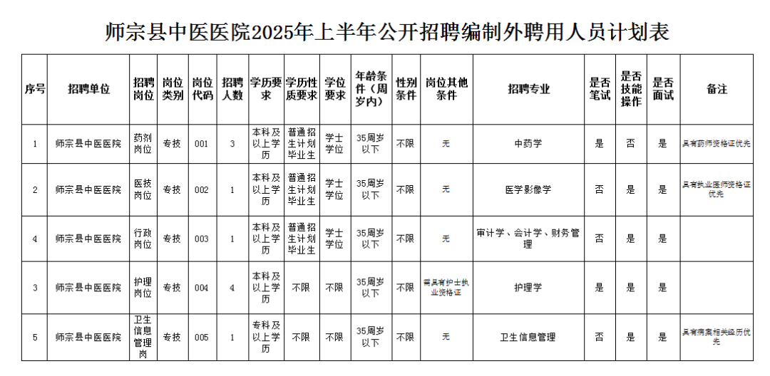 附件:1、師宗縣中醫(yī)醫(yī)院2025年上半年公開招聘編制外聘用人員計(jì)劃表